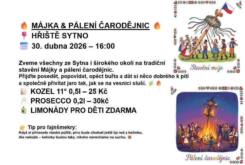 Zveme všechny ze Sytna a širokého okolí na tradiční stavění májky a pálení čarodějnic.